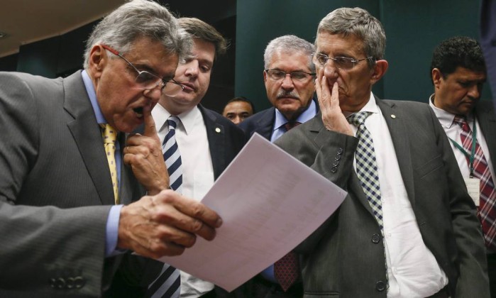 Deputados governistas Beto Mansur, Baleia Rossi, José Rocha e Darcísio Perondi conferem a lista de votos na Comissão de Constituição e Justiça - é pe Coelho / Agência O Globo